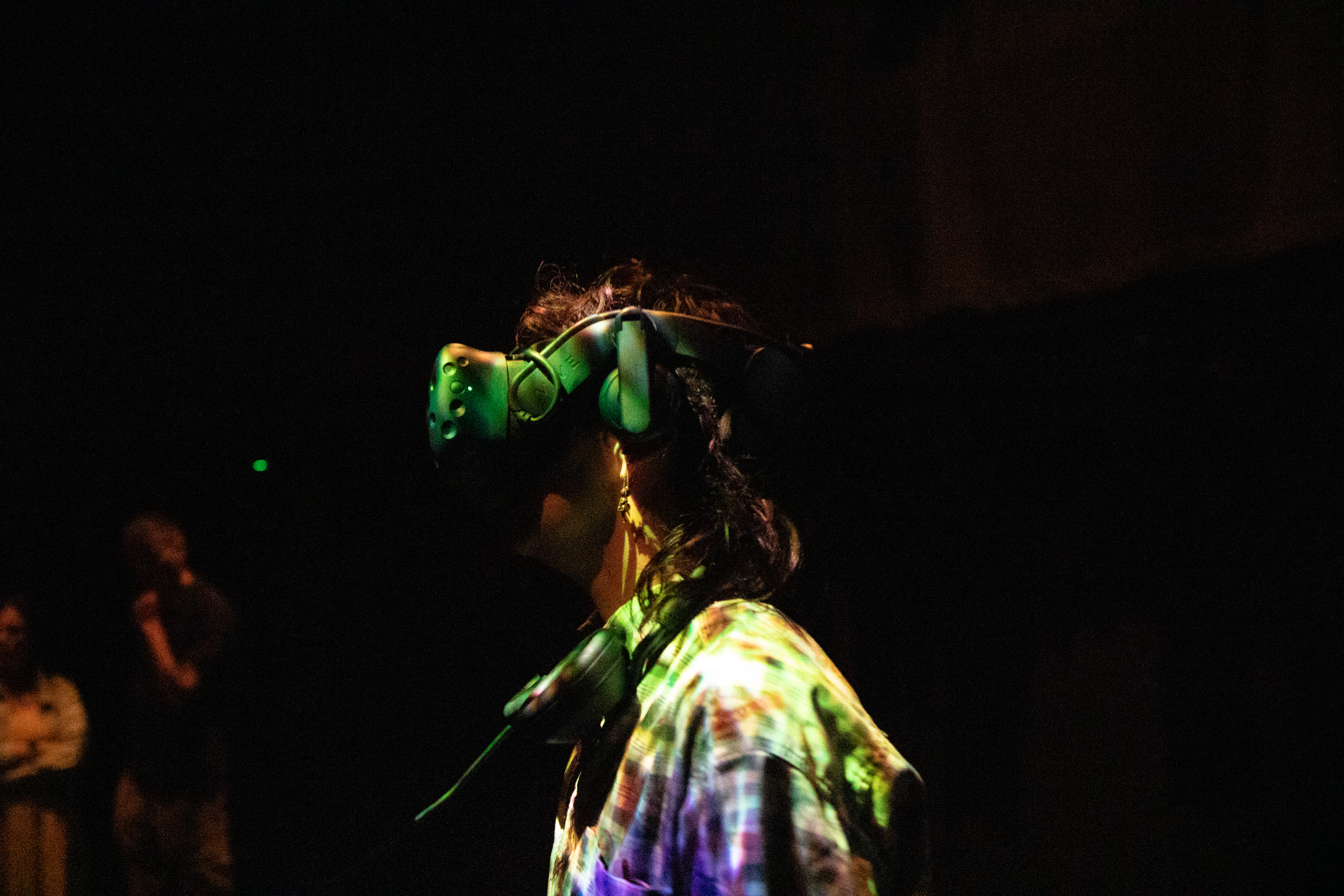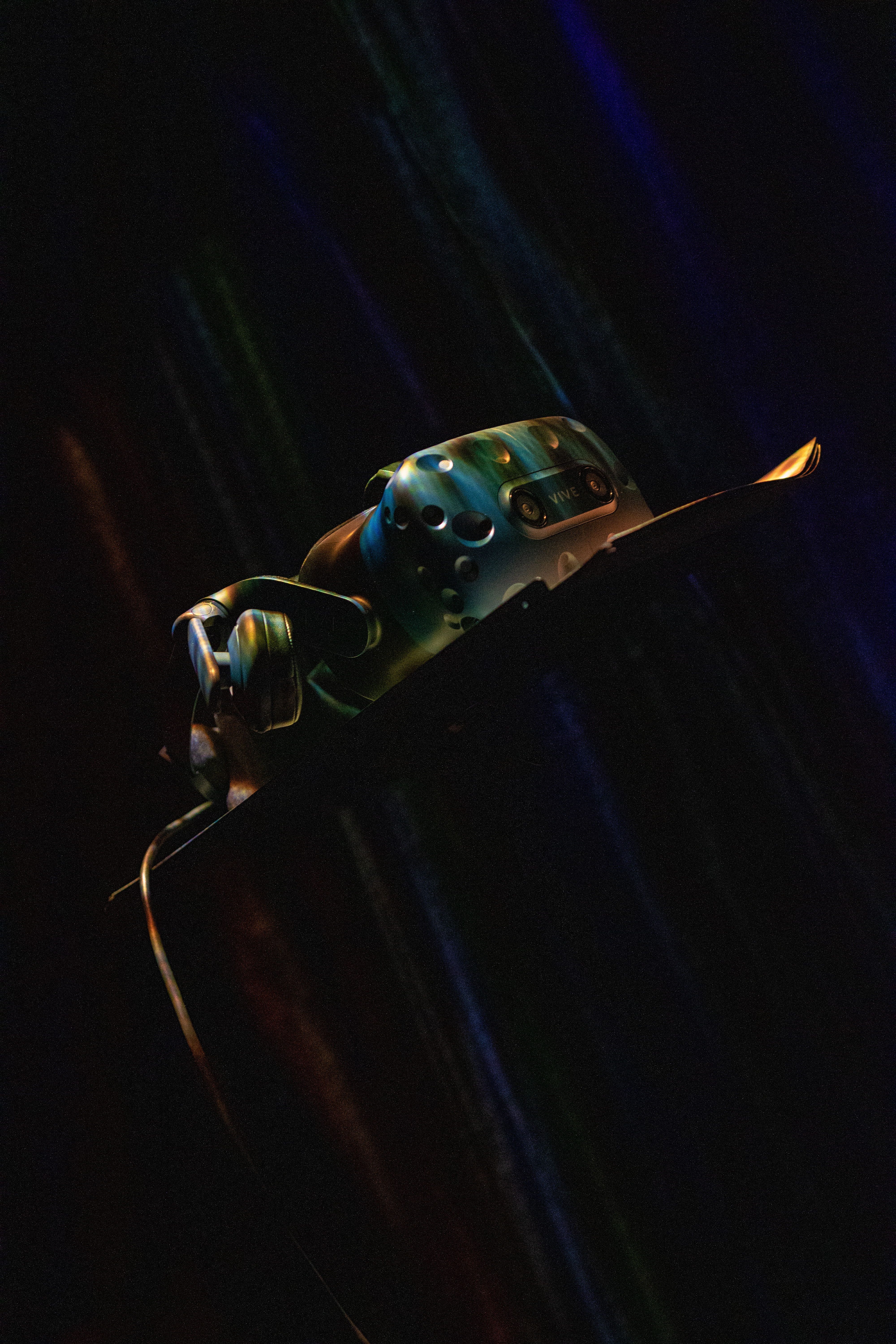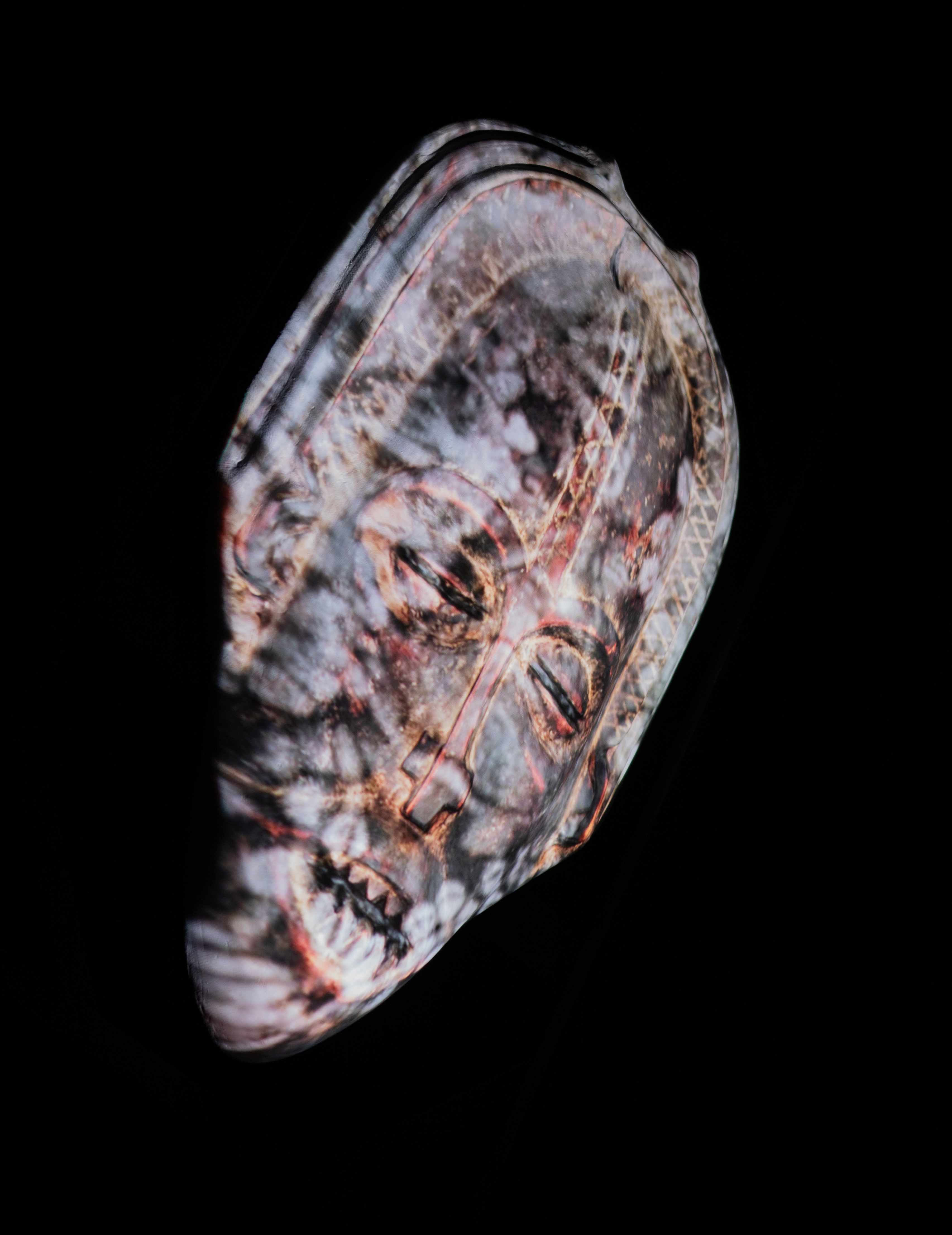 The installation extends beyond headsets through projection mapping. A digitally processed and modified mask form serves as a projection surface, allowing the artifact to appear at monumental scale. Mapping the mask's texture and overlaying moving imagery onto a mask-shaped object (instead of a flat screen) preserves its presence while opening up new interactive storytelling possibilities.