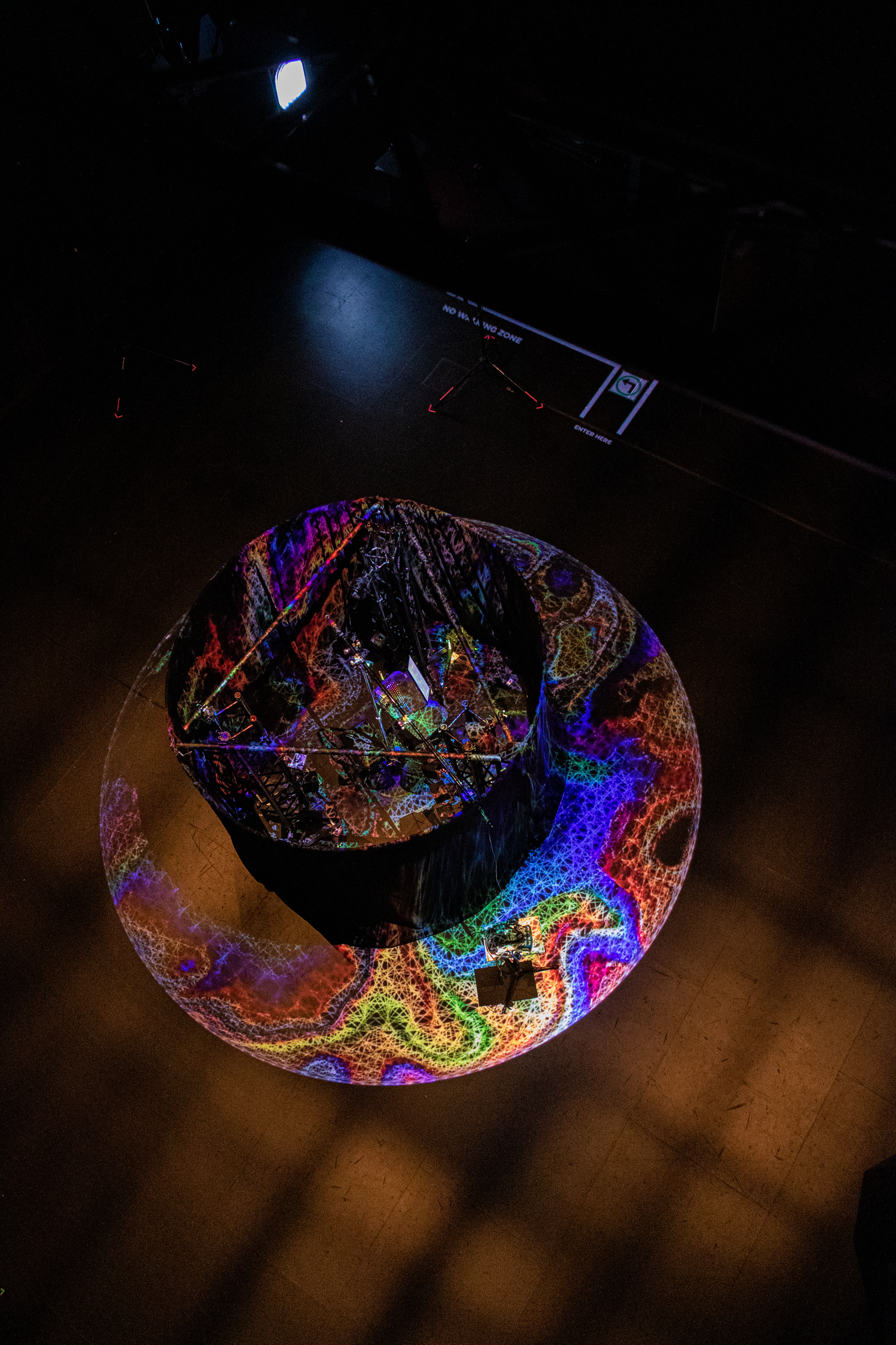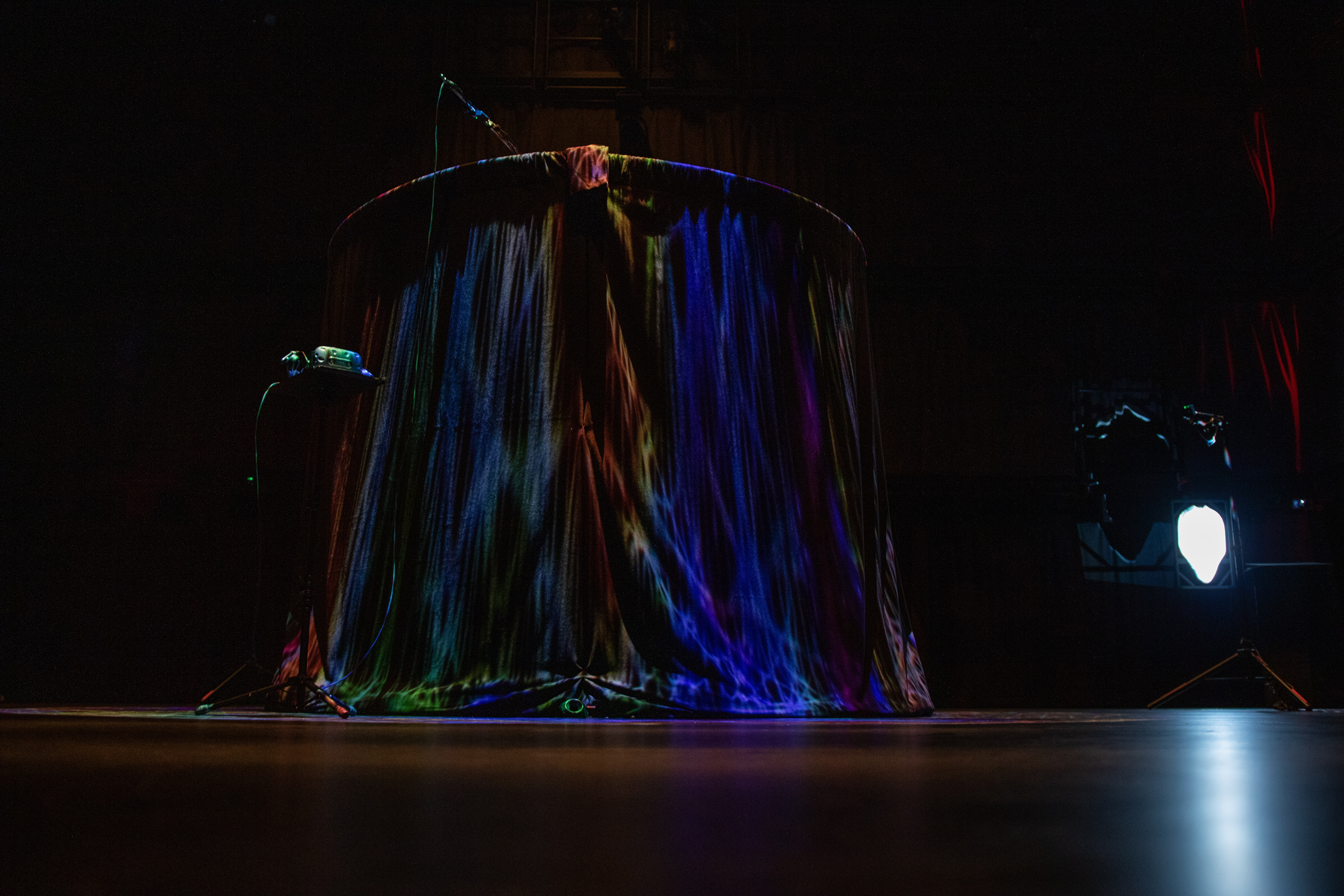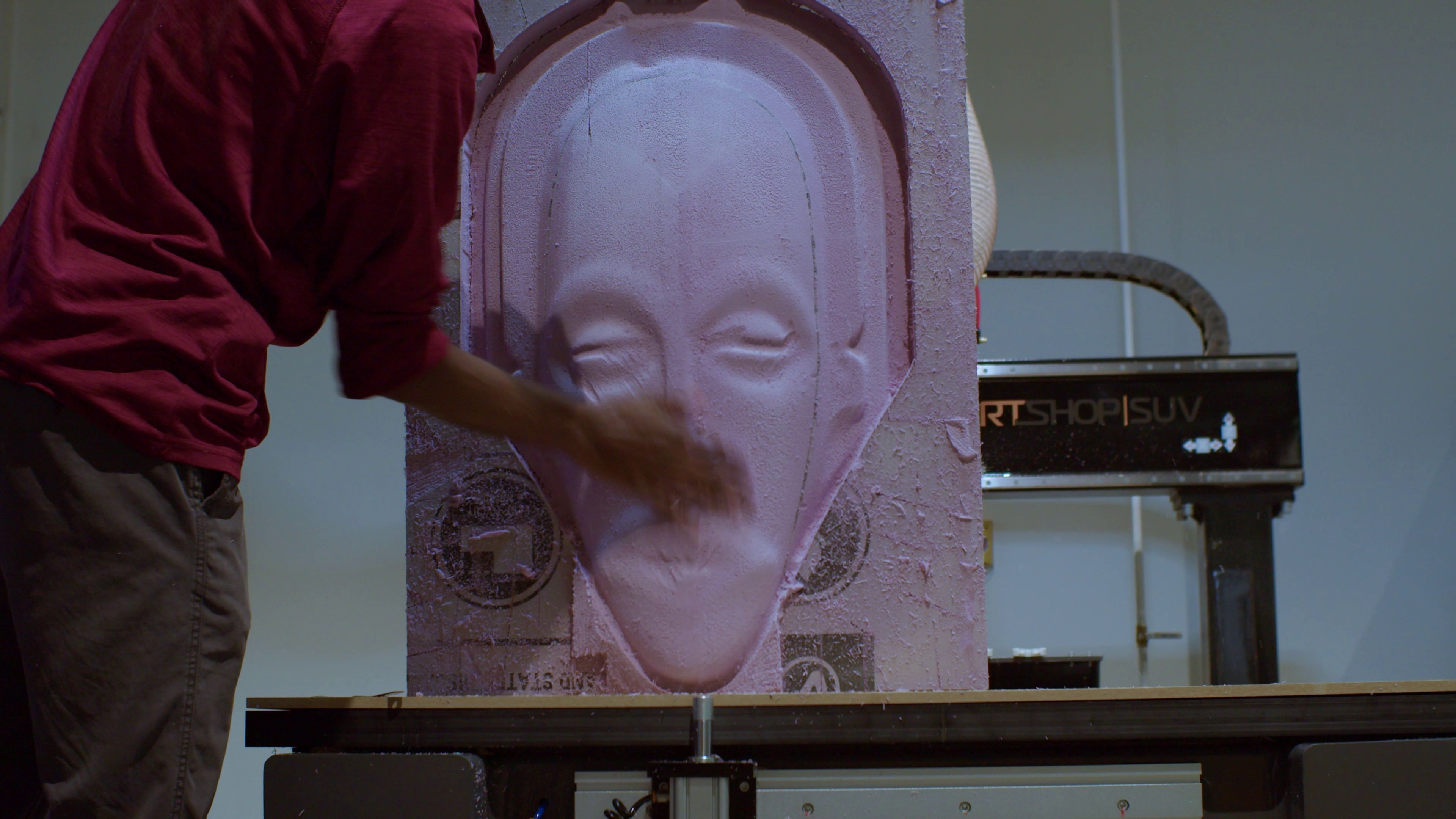 The installation extends beyond headsets through projection mapping. A digitally processed and modified mask form serves as a projection surface, allowing the artifact to appear at monumental scale. Mapping the mask's texture and overlaying moving imagery onto a mask-shaped object (instead of a flat screen) preserves its presence while opening up new interactive storytelling possibilities.